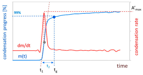 The above qualitative considerations were quantified to compare and precisely analyse kinetics. The obtained results were interpolated by the spline method and differentiated. As described in our previous research [45], condensing skeleton mass is directly proportional to the absorbance value. Thus, we use a normalised absorbance value () and identify its changes as condensation progress in relation to the final aerogel mass (). The red line in Figure 6 is the first derivative (), and it gives information about condensation rate evolution during the whole process. It also provides a specific and easy-to-determine point—the time when the maximum reaction rate is achieved, marked on (blue line) as a grey dot. By making a tangent line to this point, it is possible designate the assumed time of the nucleation phase . Another point that we can quantify is the gel point. In our previous works, we observed that for particle-aggregate structures (nucleation and growth mechanism), the gel point was approximately when the normalised absorbance was equal to 99%. We assumed this point as the beginning of the third phase—the plateau. The period between these two points is the time of the second phase .