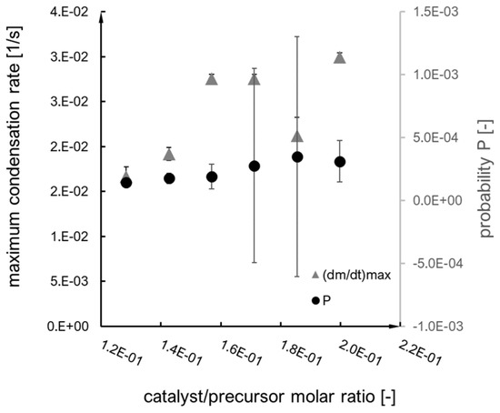 Dependence of probability and maximum condensation rate (dm/dt)max on base/precursor molar ratio.