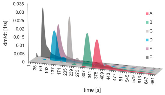The curves obtained experimentally (Figure 7) are sigmoidally shaped, with a short period of the first phase compared to the second one (Figure 8). With the increase in the catalyst/precursor molar ratio, the gelation time decreases rapidly (A–D syntheses), then more slowly (E, F syntheses). When we look at the maximum value of the first derivative (condensation rate) (Figure 9), one can notice a drop for D and E syntheses. The dependence of dm/dt on time or reaction is presented in Figure 10. We can assume that three factors connected with dm/dt have an impact on the gelation time value:
