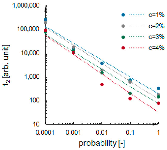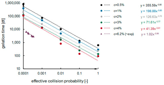 Having in mind all of the adopted simplifications and assumptions within the model (discussed in the following Section 3), we attempted to compare the shape of the kinetics phase with a focus on the second phase of gelation, because it is the only phase that occurs for both the numerical and experimental system, and we can define the length of the phase based on the kinetic curve shape in a precise and repeatable way. We assumed that the duration of this phase is related to the maximum value of the condensation rate . The ratio was calculated on the basis of experimental results and estimated for numerical data by extrapolating results for higher concentrations and interpolated for the probability of an effective collision per time step included in Table 3.