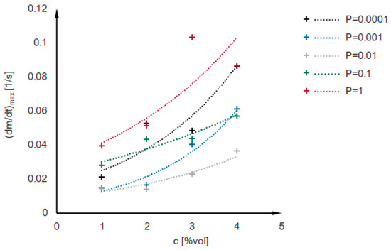 Kinetics curves obtained numerically for the mentioned 25 cases are presented in Appendix B. There is no first gelation phase, as nucleation is not considered during simulations. The dependence of the second phase duration on effective collision probability for variable concentrations of secondary particles in a system is presented in Figure 11. The dependencies have a power function character, shown as dotted lines. The values of the maximum condensation rate obtained for numerical simulations are presented in Figure 12. One can notice that the maximum condensation rate increases with increased particle concentration. It can be explained by referring to the mechanisms presented in Figure 6—the more particles we have, the more clusters will be created simultaneously, and a higher increase in reaction rate will be observed once the clusters reach the detectable threshold mass. However, there is no constant manner in the presented relation—the numerical kinetics curves are not as smooth and applicable for interpolation and differentiation as experimental curves obtained with low measuring time interval values. However, when looking globally at the numerical results (Appendix B, Figure 11 and Figure 13), we see that reaction proceeds faster when: