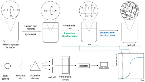 The synthesis method was the two-step, acid–base sol–gel synthesis as described by Rao et al. [57]. The reaction mixture was prepared by mixing the proper volume of metyltrimethoxysilane (MTMS, purchased from Sigma-Aldrich, St. Louis, MO, USA) as a silica precursor, methanol (MeOH, Stanlab, Lublin, Poland) as a solvent and an aqueous solution of oxalic acid (concentration 0.01 M, Sigma-Aldrich) as an acidic catalyst to initiate the hydrolysis reaction. After a suitable time for this reaction to occur, an aqueous solution of ammonia (1 M, Eurochem BGD, Tarnów, Poland) was added to the mixture as the base catalyst of the gelation reaction. As a result, the alcogel was obtained. Six samples were chosen for the condensation kinetics investigation. All samples were prepared to have a constant MTMS/MeOH ratio (vol. 1:2) and a variable volume of aqueous catalyst solutions. Chemical compositions are presented in Table 6.