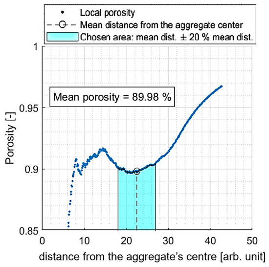 Scheme of porosity designation. Exemplary plot presenting local porosity dependence on distance from the aggregate’s centre and the chosen representative area.