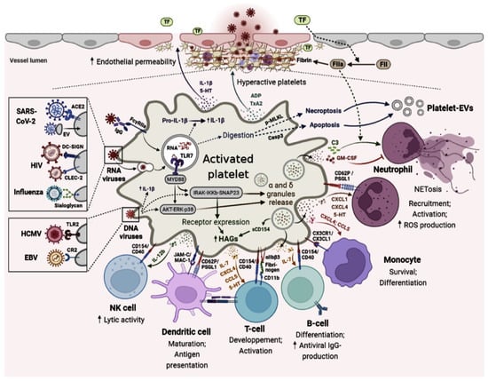 As for IL-7, activated platelets was shown to be one of the major sources of this cytokine [21]. Consequently, considering IL-7 signaling during viral infection, remarkably increased numbers of T cells’ effector were noted, suggesting its role in immune cell expansion [22]. After platelets recognize the pathogen, they become activated, and the activated platelets, via various mechanisms, kill or sequester the pathogen by activating neutrophils and macrophages. As part of the innate immune response, platelet neutrophil interaction leads to neutrophil extracellular traps (NETs), which can enhance platelet adhesion, activation, secretion, and aggregation inducing microthrombi formation [23].