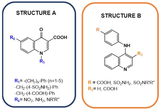 As a continuation of this research and considering that for the antimalarian mefloquine (Figure 1A), a Panx-1 inhibitor profile has recently been highlighted [], in the present study, we report the design, synthesis and pharmacological evaluation of new Panx-1 blockers with a quinoline scaffold (compound of type A and B, Figure 2). To generate group A quinolones, those groups and functions found to enhance inhibitory function in our previously published indoles [] were inserted into the quinolone backbone. On the other hand, the new quinoline derivatives of type B show at position 4 of the scaffold an aniline, which is substituted at the para position with sulfonamides or carboxyl groups.