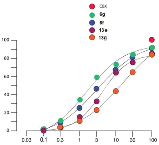 Compounds are predicted to be moderately soluble (10−5/−6 mol/L range) with low gastrointestinal absorption except for 13g, which was predicted to be an inhibitor for CYP1A2 but not for the other cytochrome. Compounds 6f, 6g and 13e were predicted inhibitors for CYP2C9; 13e was predicted to be an inhibitor also for CYP2C19 and CYP3A4. None of the compounds were predicted substrates for these CYP (Table S9 in Supplementary Materials). Our compounds were predicted with low intestinal absorption after oral administration as well as low skin permeability (Log Kp < −2.5), and 6g, 13e and 13g were predicted as PGP substrate (Table 4).