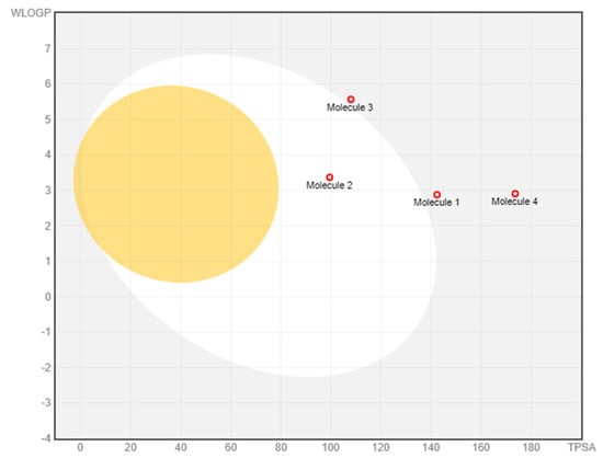 BOILED-Egg plot. Points located in the BOILED-Egg’s yellow are the compounds predicted to permeate the BBB passively. Conversely, the ones in the white are the molecules predicted to be only passively absorbed by the gastrointestinal tract. Legend: 6g-molecule 1; 13g-molecule 2; 13e-molecule 3; 6f-molecule 4.
