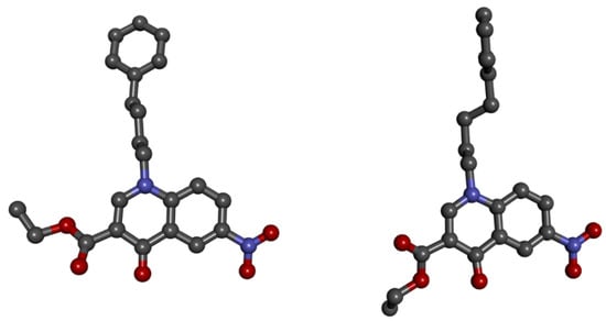 In the asymmetric unit of 4d, two independent not superimposable (see Figure 5) molecules of 4d are present. The 4d compound is, as expected, an N-alkylated one. Both the two independent molecules (A and B) present an almost planar skeleton (defined by the non-hydrogen atoms of the 4-quinolone moiety; the max deviation from the plane is due to C9: 0.032(4) and 0.066(4) Å, for A and B, respectively) that forms angles of 13.3(2)/9.9(1) and 29.9(1)/21.3(2)° with the nitro and the ester moieties (A/B, respectively). In addition, in the A molecule, the carbonyl oxygen atom of the ester group is cis disposed with respect to the oxygen atom of the 4- quinolone moiety, whereas in the B molecule, the two atoms are trans-disposed (see Table 6 and Figure 6). Moreover, the orientation of the two N-alkyl pendants is different. In fact, although in A, the phenyl ring forms an angle of 22.9(1)° with the mean plane containing the 4-quinolone moiety, in B, the angle is 72.3(1)° (see Figure 6).
