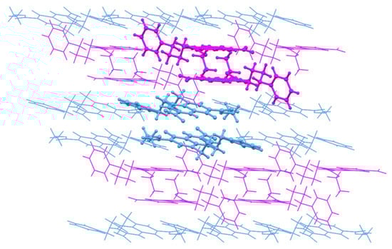Crystal packing of 4d viewed along the c-axis. Molecules of A are light blue, molecules of B are in magenta. The A⋯A and B⋯B dimers are evidenced by ball and stick representation.