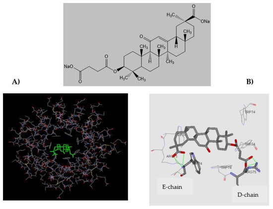 Docking of Carbenoxolone (CBX). The lower-energy pose of CBX in the extracellular domain of the PANX1 channel (panel (A)). Particular of the hydrogen bond interactions between CBX and the Arg75 of E- and D-chain (panel (B)).
