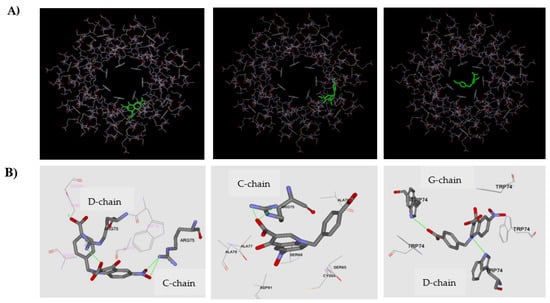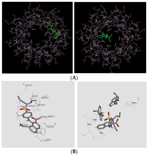 The docking poses of compound 6g are illustrated in Figure 9. Of the conformations proposed by AutoDock, 30% show lower free energy (about −10.5 kcal/mol), whereas the remaining others have energy in the range of −8.7 kcal/mol. From the docking analysis, it can be seen that the three lower-energy poses ‘locate’ in different areas of the channel extracellular space (Figure 9A). As can be seen in the figure, 6g finds the possibility of docking between both chains (the two protomers) C/D and in the channel, analogous to CBX. The possibility of accommodation between the chains could be explained by taking into account the small size of the molecule, which is, therefore, able to move within the extracellular domain. Figure 9B highlights (in green) the strongest interactions between 6g and the amino acid residues in the three different poses with lower free energy. The amino acids involved are Arg75 and Trp74 of different chains, as shown in the figures.