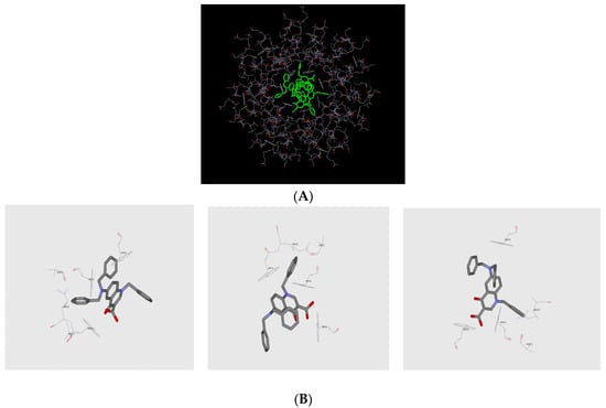 Docking of compound 10. The lower-energy poses of 10 in the extracellular domain of the PANX1 channel (panel (A)). The enlargement of the three poses shows the lack of interaction between 10 and the amino acid of the ‘CBX site’ (panel (B)).