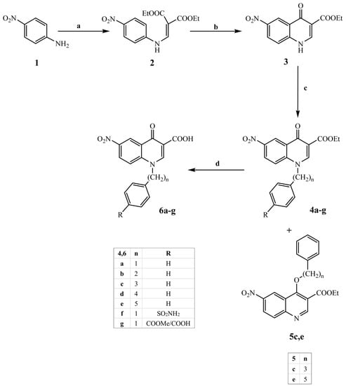 The procedures followed to obtain all new products are shown in Scheme 1, Scheme 2 and Scheme 3, and the structures were confirmed on the basis of analytical and spectral data. The reagents used were synthesized by us (see Supporting Information) or are commercially available. Scheme 1 depicts the synthetic pathway yielding the final compounds 6a–g. The quinolinone intermediate 3 [], which was synthesized according to the procedure reported in the literature starting from 4-nitroaniline 1, was treated with the appropriate (substituted) arylalkyl halide and commercially available, anhydrous potassium carbonate (K2CO3) in dry DMF, producing the N-alkylated derivatives 4a–g (4a []). The reaction of intermediate 3 with (3-chloropropyl)benzene or 1-bromo-5-phenylpentane as the reagent led to a mixture of N- and O-alkylated derivatives (4c,e and 5c,e, respectively) in a ratio of approximately 4:1. Finally, the intermediates 4a–g underwent basic hydrolysis with sodium hydroxide (NaOH 10%) and EtOH 96% affording the final acid compounds 6a–g. Because the 1H-NMR spectra of the couples of the two isomers (4c,e and 5c,e) were very similar and did not allow a distinction, to assign the correct structure to both isomers, an NMR spectroscopy study was performed. 13C-NMR spectra gave the initial information showing two different chemical shift values (77 ppm and 54 ppm) for the methylene of the spacer, which was linked to nitrogen or to the oxygen, values at a later time assigned to O-CH2 and N-CH2, respectively. The use of 2D-NMR techniques, including Heteronuclear Single Quantum Correlation (HSQC) and Heteronuclear Multiple Bond Correlation (HMBC), provided complementary information and allowed us to establish the exact structure of the isomers. In particular, the HMBC spectra highlighted the presence of the coupling between the methylene protons and the quinolinone C2 carbon for the N-alkylated compounds (4c and 4e), and obviously not for the O-alkylated isomers (5c and 5e). In addition, in the HMBC spectrum of the O-alkylated 5c and 5e, it is possible to see the coupling between methylene protons and the C4 carbon of quinoline (see spectra in Supporting Information).