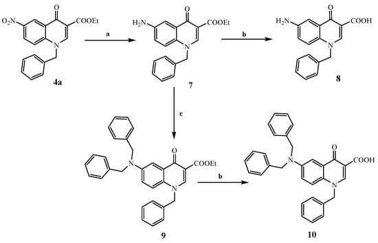 The synthesis of 6-aminquinolinones is depicted in Scheme 2. The reduction of the nitro to amino group was achieved on intermediate 4a by catalytic hydrogenation in Parr apparatus (compound 7 []); the latter was both hydrolyzed to acid 8 or alkylated at the amino group with benzyl bromide and K2CO3, thus yielding compound 9, which, in turn, was transformed into the acid 10.