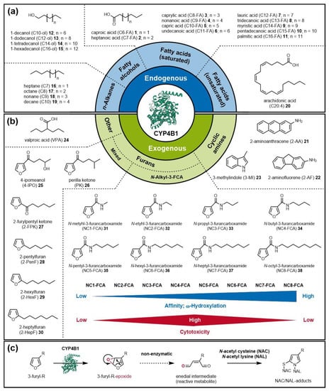 - Baer, B.R.; Rettie, A.E. CYP4B1: An enigmatic P450 at the interface between xenobiotic and endobiotic metabolism. Drug Metab. Rev. 2006, 38, 451–476. [Google Scholar] [CrossRef]