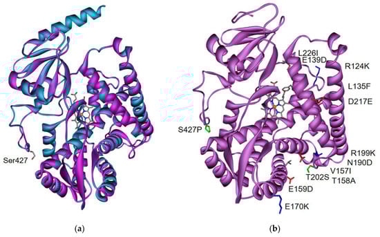 - Zheng, Y.M.; Fisher, M.B.; Yokotani, N.; Fujii-Kuriyama, Y.; Rettie, A.E. Identification of a meander region proline residue critical for heme binding to cytochrome P450: Implications for the catalytic function of human CYP4B1. Biochemistry 1998, 37, 12847–12851. [Google Scholar] [CrossRef]
