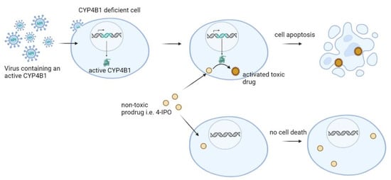 - Rainov, N.G.; Dobberstein, K.-U.; Sena-Esteves, M.; Herrlinger, U.; Kramm, C.M.; Philpot, R.M.; Hilton, J.; Chiocca, E.A.; Breakefield, X.O. New prodrug activation gene therapy for cancer using cytochrome P450 4B1 and 2-aminoanthracene/4-ipomeanol. Hum. Gene Ther. 1998, 9, 1261–1273. [Google Scholar] [CrossRef] [PubMed]