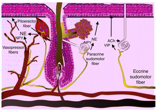 Autonomic nerves lie in dermis near blood and lymphatic vessels and dermal appendages and except for facial skin are only sympathetic. These fibers belong to cutaneous vasoconstrictor neurons, piloerector neurons and sudomotor neurons (Figure 1) [39]. Both types have C-type unmyelinated axons and are located in paravertebral ganglia [40]. Microneurographic studies have shown that one sympathetic unit innervates 24–350 mm2 of skin [41]. Immunolabeling histological studies allowed the differentiation of noradrenergic sympathetic fibers near arterioles or erector pili muscles and apocrine sweat glands and cholinergic sympathetic fibers near eccrine sweat glands [42]. These fibers lay in dermis at different depths. Contrary to sensory fibers, sympathetic fibers do not directly penetrate epithelium basal membrane [43].