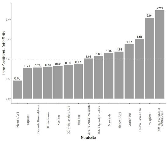 LASSO logistic regression analyses comparing significant metabolites (untargeted platform) at baseline and after strawberry intervention in adults with features of metabolic syndrome.
