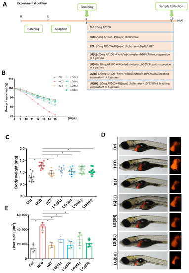 Eight-day post-fertilization (dpf) zebrafish larvae were randomly divided into 7 groups (n = 100 per group) and fed different diets as follows: (1) Control (Ctrl), AP100 (20 mg/tank per day); (2) high cholesterol diet treated groups (HCD), AP100 (20 mg/tank per day) and 4% (w/w) cholesterol; (3) Bezafibrate-treated groups (BZT), AP100 (20 mg/tank per day), 4% (w/w) cholesterol and 10 µM/L BZT; (4) L. gasseri suspension groups with low concentration of bacteria (LG (SL)), AP100 (20 mg/tank per day), 4% (w/w) cholesterol and 106 CFU/mL suspension of L. gasseri; (5) LG (SH) groups, AP100 (20 mg/tank per day), 4% (w/w) cholesterol and 107 CFU/mL suspension of L. gasseri; (6) LG (BL) groups, AP100 (20 mg/tank per day), 4% (w/w) cholesterol and 106 CFU/mL breaking supernatant of L. gasseri; (7) LG (BH) groups, AP100 (20 mg/tank per day), 4% (w/w) cholesterol and 107 CFU/mL breaking supernatant of L. gasseri. All of the groups were maintained following the schedule of Figure 1A.