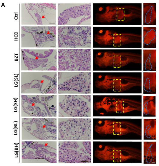 Subsequently, liver pathological changes in the liver of the corresponding groups were examined using H&E staining. In Figure 2A, zebrafish livers are indicated with red arrows. It could be observed that in normal liver tissue, the hepatocytes with clear polygonal shapes were joined together by a tight junction and with well-preserved cytoplasm and prominent nucleus. However, in the HCD-treatment groups, macrovesicular steatosis was obviously visible. The liver presented various tiny and large vacuoles, with loose cell-to-cell contact, dissociated and irregularly shaped cells and macrovacuoles. After L. gasseri treatment for one week, the deterioration of liver histological changes was obviously reversed. Moreover, the Nile red staining results showed that the average red fluorescence intensity in the liver was remarkably strengthened in the HCD treatment group as compared to the control (Figure 2B). However, the average intensity of the L. gasseri administered groups was comparatively weaker than the HCD groups. The improvement effects of various concentrations and different processed ways of L. gasseri on lipid deposition were almost equal to BZT, which revealed that L. gasseri might have a potential role in the alleviation of HCD-induced liver steatosis in neutral lipid deposition.