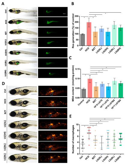 Effects of L. gasseri on HCD-induced oxidative stress and macrophage aggregation in the liver of zebrafish larval. (A) Reactive oxygen species (ROS) staining with 2′,7′-dichlorodihydrofluorescein (DCFH-DA). Liver was outlined with yellow dot circles. (B) Quantification of ROS staining by measuring the green fluorescence density of zebrafish liver (n = 10). (C) Detection of the contents of malondialdehyde (MDA) in vivo (n = 10). (D) Infiltration of macrophages in the liver was examined using the reporter transgenic line Tg (mpx:mCherry). Macrophages were labeled with red fluorescence. Liver was indicated with blue dot circles. (E) Quantification of the number of macrophages in the liver of zebrafish (n = 10). Scale bars = 100 µm. Values were represented as mean ± SD. * p < 0.05.