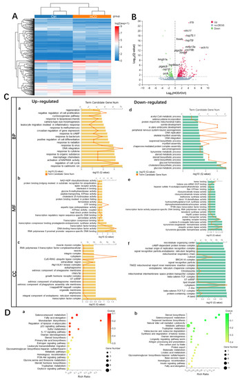 Transcriptome profiling of HCD-induced alternations of gene expression during liver injury in zebrafish larvae. (A) Hierarchical clustering of RNA-Sequencing data showed differentially expressed genes (DEGs) between Ctrl and HCD-induced groups (|log2FC| > 0, Q value < 0.05) by Pearson correlation method without mean centering. High and low levels of gene expression were represented by red and blue. (B) Volcano plots of identified DEGs of log2 (fold change) versus-log10 (Q value). The up-regulated DEGs are indicated with red dots, and the down-regulated DEGs are indicated with blue dots. Grey dots represent non-DEGs. (C) GO annotation, including biological process (BP) (a,d), molecular function (MF) (b,e) and cellular component (CC) (c,f) were characterized by DAVID analysis. (D) KEGG pathway analysis of DEGs. The top 20 enriched KEGG pathways associated with up- and down-regulated mRNA transcripts were presented in bar charts (a,b). Q < 0.05 were considered to be enriched.