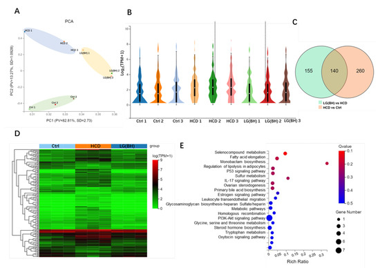 To unravel the transcriptional programs regulated by L. gasseri, we further performed RNA-seq comparison analysis of Ctrl, HCD and LG (BH). In the principal component analysis (PCA), the samples of the same treatment group were clustered together, demonstrating a significant divergence (p < 0.05) among the control, HCD and LG (BH) (Figure 5A). The violin plot displayed the distribution of log2 (TPM + 1) of gene expression, indicating the decreased gene expression of Ctrl and LG (BH) relative to HCD (Figure 5B). The Venn diagram in Figure 5C displayed that there were 140 overlapping DEGs between HCD vs. Ctrl and LG (BH) vs. HCD (|log2FC| > 0, Q value < 0.05). The differential cluster heat map showed the fold change (log2 fold change) of the overlapping 140 DEGs, the majority of which (106) were upregulated by HCD and downregulated after the treatment with L. gasseri (Figure 5D). This group included keratin 96 (krt96), histone deacetylase 10 (hdac10), elongases of very long-chain fatty acids 7b (elovl7b), insulin receptor substrate 2a (irs2a), glycine N-methyltransferase (gnmt), EH-domain-containing 1a (ehd1a), myosin, light chain 9b (myl9b), C-X9-C motif containing 1 (cmc1), Rab acceptor 1 (rabac1), claudin 15-like b (cldn15lb), membrane-spanning 4-domains, subfamily A, member 17A.9 (ms4a17a.9), pleckstrin homology-like domain family A member 2 (phlda2), Rho guanine nucleotide exchange factor (GEF) 3 (arhgef3l), prostaglandin–endoperoxide synthase 2b (ptgs2b), troponin I4b, tandem duplicate 1 (tnni4b.1), transmembrane protein 104 (tmem104), mesoderm-induction early response 1, family member 3 b (mier3b), cyclin-dependent kinase 21 (cdk21), potassium voltage-gated channel, subfamily H (eag-related), member 6b (kcnh6b), NADPH oxidase organizer 1a (noxo1a), actinin, alpha 2b (actn2b), phorbol-12-myristate-13-acetate-induced protein 1 (pmaip1), 3’-phosphoadenosine 5’-phosphosulfate synthase 2a (papss2a), ciliogenesis and planar polarity effector complex subunit 1 (cplane1), nectin cell adhesion molecule 4b (nectin4b), chemokine (C-X-C motif) ligand 18b (cxcl18b), integrin subunit beta 7 (itgb7), membrane-spanning 4-domains, subfamily A, member 17a.2 (ms4a17a.2), protein tyrosine phosphatase non-receptor type 21 (ptpn21). With regards, 34 DEGs were downregulated in HCD but upregulated after L. gasseri treatment, including ms4a17a.8, importin 13 (ipo13), N-deacetylase/N-sulfotransferase (heparan glucosaminyl) 1a (ndst1a), transcription factor 4 (tcf4), ubiquitin interaction motif containing 1 (uimc1), heat shock protein 90, alpha (cytosolic), class A member 1, tandem duplicate 1 (hsp90aa1.1), kynurenine aminotransferase 3 (kyat3), RNA-binding protein, mRNA-processing factor 2a (rbpms2a), reticulon 4a (rtn4a), solute carrier family 7 member 2 (slc7a2), ELMO-domain-containing 2 (elmod2), SET and MYND-domain-containing 2b (smyd2b), eukaryotic elongation factor, selenocysteine-tRNA-specific (eefsec), claudin 15b (cldn15b), hydroxysteroid (17-beta) dehydrogenase 7 (hsd17b7) (Supplement Tables S1 and S2).
