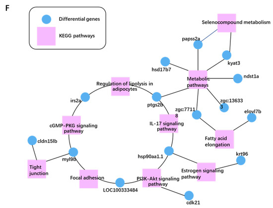 The total RNA was isolated, and the RNA quality was assessed using an Agilent 2100 Bioanalyzer (Agilent Technologies, Palo Alto, CA, USA). RNA sequencing was implemented after the construction of the library using the TruSeq PE Cluster Kit V3-cBot-HS (Illumina, NEB, USA). All libraries were loaded into the same lane of the HiSeq 2000 (TruSeq SBS KIT-HS V3, Illumina, Santa Clara, CA, USA) at Beijing Genomics Institute (Shenzhen, China). The raw reads obtained were filtered through SOAPnuke (v1.5.2) to remove low-quality reads and linker sequences. The clean reads were mapped to the zebrafish reference sequence database (Danio rerio, UCSC version danRer7, 2010) with TopHat2.0 (http://ccb.jhu.edu/software/tophat/index.shtml, accessed on 2 December 2020) [102]. DESeq2 (v1.4.5) was used to identify the differentially expressed genes (DEGs) between groups. The parameters for assessing transcripts with differential expression were Q value < 0.05 and |log2FC| > 1 [103]. The heatmap was generated with Heatmap (v1.0.8) according to the identified differentially expressed genes in each sample. The DEGs were analyzed with GO (http://www.geneontology.org/, accessed on 7 December 2020), the Database for Annotation, Visualization and Integrated Discovery (DAVID), KEGG (http://www.kegg.jp/kegg/pathway.html, accessed on 7 December 2020) enrichment annotation and BGI online system, Dr. Tom (BGI-Shenzhen, Shenzhen, China) to take insight to the changes in gene expression and signaling.