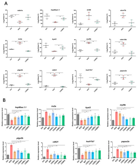 Additionally, the expression of genes at key junction nodes was analyzed based on the RNA-sequencing results (Figure 6A). Of these genes, it was shown that hsp90aa1.1, kyat3, hsd17b7 were significantly upregulated in the L. gasseri-treated groups compared to the HCD model groups. Moreover, the expression of irs2a, myl9b, ptgs2b, cdk21 and papss2a were remarkably increased by HCD, and L. gasseri played critical roles in reducing their expression levels to normal stages. Afterward, these genes were selected to be subjected to an mRNA expression validation experiment with qRT-PCR (Figure 6B). The results confirmed that the expression levels of hsp90aa1.1, kyat3 and hsd17b7 were decreased after HCD treatment, and the lowering effect was reversed by LG administration. In contrast, the expression levels of irs2a, myl9b, ptgs2b, cdk21 and papss2a, which were increased after HCD induction, and were reduced to varying degrees by L. gasseri, indicating that these genes may potentially explain the inhibitory mechanism of L. gasseri on HCD-induced liver injury.