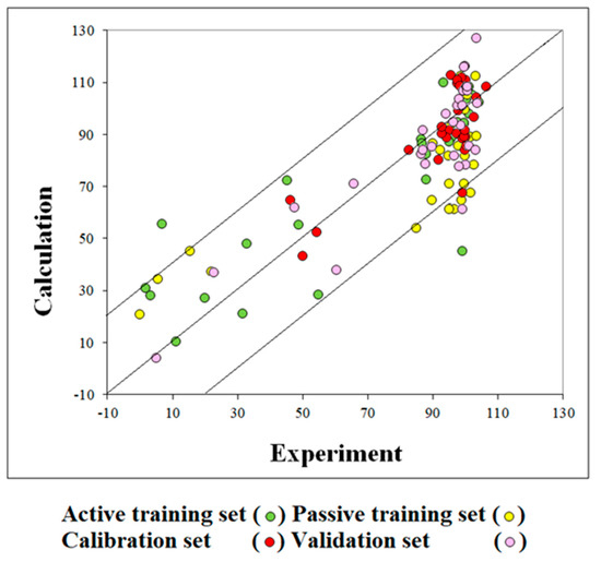 The and are correlation coefficients between the observed and predicted endpoints for the active and passive training sets, respectively. The IIC is the index of ideality of correlation [33,34]. The IIC is calculated using data from the calibration set as follows: