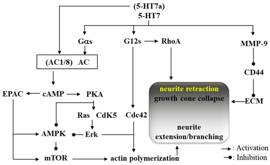 Activation of 5-HT7 enhances synthesis of cyclic adenosine monophosphate (cAMP) via activation of adenylyl cyclase [4]. Increasing cAMP activates signalling of both protein kinase A (PKA) and the exchange protein directly activated by cAMP (EPAC) [10,118,120]. These two signalling pathways affect various signalling transductions via phosphorylation of target proteins, leading to the propagation of the signalling to the next biochemical events. Subsequently, enhanced PKA stimulates cyclin-dependent kinase 5 (Cdk5) [10,118] and Ras [121,122], resulting in serine/threonine extracellular signal-regulated kinases (Erk) signalling activation [121,123]. Activation of EPAC also indirectly enhances Erk signalling [121,123]. The second signalling pathway regulates adenosine monophosphate-dependent protein kinase (AMPK) [42,47,48] via inhibitory PKA and stimulatory EPAC [124]. Furthermore, 5-HT7-induced Ras and EPAC signalling promote the activation of the mammalian target of rapamycin (mTOR) [125], but activated AMPK supresses mTOR signalling [126]. Activated signalling of Erk and mTOR by 5-HT7 enhances neurite outgrowth in embryonic brains [122,127].