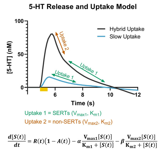 Representative model traces of the hybrid (dark grey) and slow (blue) uptake signals are shown. The portions of the curve associated with uptake 1 (SERTs) (green) and uptake 2 (non-SERTs) (orange) are noted. The full model that describes the serotonin concentration as a function of release, autoreceptors, and the two uptake mechanisms is included at the bottom of the figure.