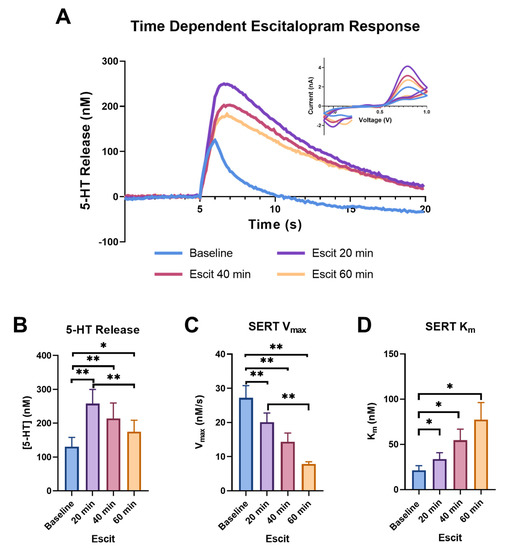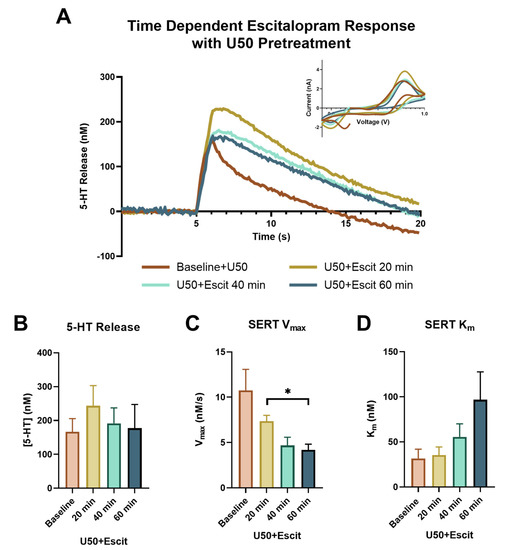 The concentration vs. time traces for the baseline (orange), 20 min (yellow), 40 min (light green), and 60 min (teal) following escitalopram (1 μM) are shown in (A), with the corresponding cyclic voltammograms in the inset. The peak height of the serotonin release is shown in (B), with no significant effects found. SERT Vmax for each time point is shown in (C), with only one set of time points being significantly different, as indicated on the graph (Tukey’s post hoc, * p < 0.05). SERT Km, as shown in (D), demonstrated the main effect of time (ANOVA, p < 0.05).