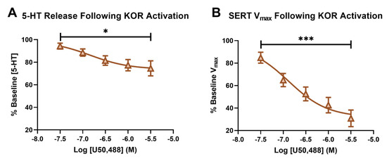 The percent baseline of the peak height following a concentration–response curve of U50 is shown in (A). The main effect of the concentration of U50 on the serotonin release (RM-ANOVA * p < 0.05) is shown. The percent baseline of serotonin Vmax following a concentration–response curve of U50 is shown in (B), with the main effect of the concentration of U50 (RM-ANOVA, *** p < 0.001).