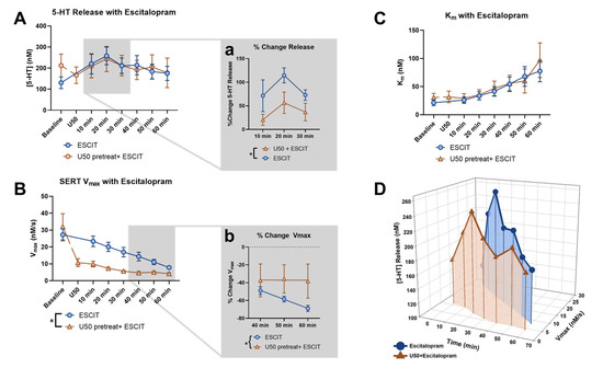 The effect of escitalopram on the peak height of serotonin release across all time points was compared for the escitalopram-alone group (blue) and the U50 pretreatment followed by escitalopram group (orange) in (A). Analyzing the last file before and following escitalopram application revealed the significant effect of time (2-way ANOVA, p < 0.05). The inset (Aa) focuses on the percent change in the first half of the time course and shows the significant effect of the groups (2-way ANOVA, * p < 0.05). The effect of escitalopram on the Vmax of SERT across all time points was compared for the two groups in (B). Analyzing the last file before and following escitalopram application revealed the significant effect of time (2-way ANOVA, p = 0.0001) and the groups (2-way ANOVA, p < 0.05), along with the interaction effect (2-way ANOVA, p < 0.01). The inset (Bb) focuses on the percent change in the last half of the time course and shows a significant difference in the linear regression of the two groups (* p < 0.05). The effect of escitalopram on the Km of SERT across all time points was compared for the two groups in (C), with no significant differences found. (D) presents the changes in the peak height of serotonin release and SERT Vmax as a 3-dimentional plot over the time course, following the application of escitalopram for each group.