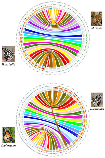 Synteny alignment of the genome of H. assimilis (male), M. cinxia (male), and D. plexippus (male). The tagged HA01 to HA30 refer to the chromosomes of the sequenced H. assimilis, the green columns refer to the chromosomes of M. cinxia, and the blue columns refer to the chromosomes of D. plexippus. HA represents the H. assimilis chromosome; MC represents the M. cinxia chromosome; DP represents the D. plexippus chromosome. The HA01 is syntenic to the MCZ chromosome and autosomes MC26 of M. cinxia and the DPZ chromosome and autosomes DP30 of D. plexippus. The densities of GC contents (34% to 36%) and DNA variations (0% to 0.3%) in H. assimilis are shown in the outer rims in order.