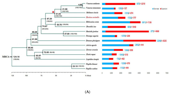 We aligned the 1453 single-copy orthologous genes of the 13 species described (Papilio bianor and Papilio xuthus as the outgroup) to reconstruct a maximum-likelihood phylogenetic tree. The time-calibrated tree showed that the divergence time of H. assimilis was approximately ~51.83 Mya (Figure 2A).