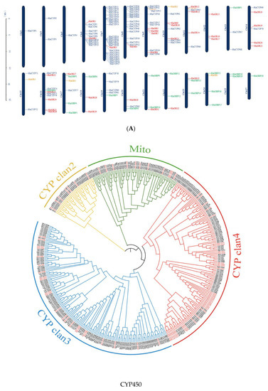 We predicted 80 cytochrome P450s, 17 glutathione S-transferase, and 26 ATP-binding cassette transporters in H. assimilis (Table S8). These associated families also showed a pattern of general expansion in H. assimilis. We focused on the P450s, since their expansion was greatest in H. assimilis. The 80 CYP genes were unevenly distributed on the 16 chromosomes, and concentrated in chromosomes 6–9 (Figure 3A). The phylogenetic analysis found the 80 CYP genes divided into 18 families (Figure 3B). The phylogenetic relationships and chromosomal locations of the CYP genes revealed that the CYPs had independent gene duplication events in different chromosomal regions in H. assimilis. Compared with the four genomes of the Nymphalidae species, saprophagous feeders (M. cinxia, V. tameamea, and V. atalanta), and nectar feeders (D. plexippus), the number of CYP genes identified in H. assimilis was comparable to the other species. The P450 genes clustered with the lineages of CYP4 (39/80 genes), CYP3 (23/80 genes), CYP2 (11/80 genes), and the mitochondrial P450 clade (7/80 genes) (Figure 3B, Table 1). The expansions of the CYP4 and CYP3 clans in H. assimilis indicated its higher probability of encountering xenobiotics in living environments.