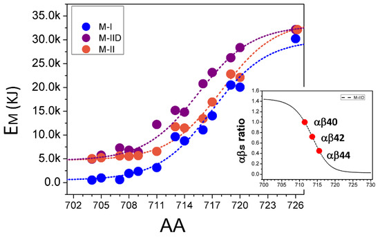 The membrane-association energy of Aβ peptides. A membrane-association energy (EM) of Aβ peptide is plotted as a function of Aβ length resulting from γ-secretase proteolysis between positions 704 and 725. EM is calculated for M-I (blue circles) and M-II (orange circles) conformations and for M-IID conformation that corresponds to M-II conformation with Asp residue added at carboxy-terminal end of Aβ peptide (purple circles). The results were fitted (smooth lines) using Equations (1) and (2). The insert shows predicted ratio of soluble and membrane associated Aβ peptides (αβs ratio) as a function of peptide size based on Equation (4). Red dots are the αβs values calculated for Aβ40, Aβ42 and Aβ44 as indicated.