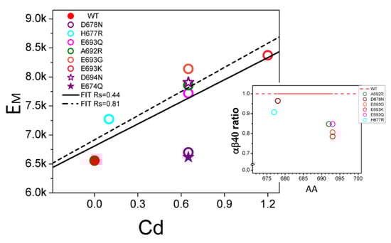 Effect of non-amyloidogenic FAD mutations in APP located in HECM domain of Aβ. The value of cd for FAD APP mutations in HECM domain of Aβ is the difference in charge resulting from mutations and calculated at isoelectric point of wild type Aβ40. D694N and E674Q are artificial mutations used for control calculations. The linear fits yield regression coefficient Rs = 0.44 (sold line, all mutants data) and 0.81 (dashed line, with D678N replaced with D694N). The insert shows predicted changes in the ratio of soluble and membrane-associated Aβ40 peptides (αβs ratio) resulting from non-amyloidogenic FAD APP mutations in in HECM domain of Aβ.
