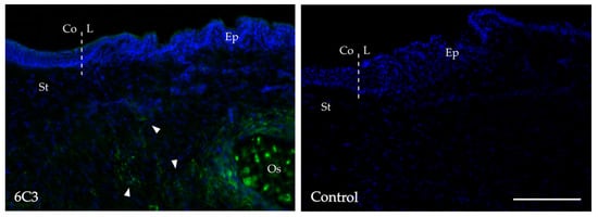 Immunolabelling of chondroitin sulphate (CS) proteoglycans in the adult avian limbus. Positive labelling (green) of CS specific epitopes recognised by monoclonal antibody 6C3 was observed in the subepithelial midstroma (white arrowheads). Nuclei counterstained with DAPI (blue). Dashed vertical white lines represent the corneolimbal junction. The primary antibody was omitted from the control section. Ep = epithelium, St = stroma, L = limbus, Co = cornea. Os = scleral ossicle. Images are representative from three individual experiments. Scale bar represents 100 µm.