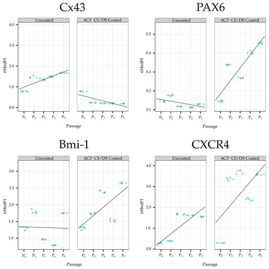 Linear regression showing the relationship between nMedFI and passage number in each coating condition for Cx43, PAX6, Bmi-1 and CXCR4. Each point represents a repeated instrument measure of nMedFI at each passage for each PSSC marker and coating.