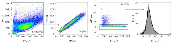 Schematic of sample plots demonstrating the gating strategy employed on raw data in FlowJo to generate graphs. Forward vs. side scatter area (FSC-A vs. SSC-A) gating was applied to identify cells of interest based on size and complexity (granularity), whereas FSC-A vs. forward scatter height (FSC-H) gating strategy was applied for the purposes of doublet exclusion. To distinguish between live and dead cells, FSC-A was gated against allophycocyanin area (APC-A) to detect fluorescence emitted by the Live/DeadTM Fixable Far Red Dead Cell stain. Finally, a fluorescein isothiocyanate area (FITC-A) vs. histogram parameter change was applied to generate a log-distribution of gated events. Pseudocoloured density plots depict the distribution of cells within a population. Blue and green correspond to areas of lower cell density, yellow corresponds to areas of mid-range cell density, and red correspond to areas of high cell density.