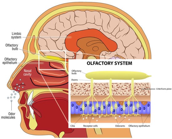 Odor molecules entering the nasal cavity are first trapped in the mucus that lines the neuroepithelium of the olfactory fossa. Within the olfactory epithelium are neurons containing olfactory G-protein-associated receptors. Olfactory information is transmitted from the olfactory neurons in the nose via the olfactory bulb (OB) to several brain areas. Interneurons project to the primary olfactory cortex and anterior hippocampus, which proceed with smell recognition and memory retrieval. The hippocampus is involved in olfactory working memory, and odor identification involves Broca’s area and the orbitofrontal and prefrontal cortices, which are also included among the olfactory cortical regions. The piriform cortices, consisting of anterior and posterior sections, represent the structures where the first cortical processing of olfactory stimuli occurs. []. These olfactory structures are considered the primary olfactory cortex. Anterior olfactory nucleus cells are responsible for odor stimulation, and the piriform cortex plays an important role in processing odor signals based on experience and learning [] (Figure 2).