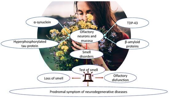 In the last decade, olfactory dysfunction was linked as an early sentinel sign of neurodegenerative disorders [,]. The high prevalence, early onset, and the development of fine olfactory tests have boosted interest in the search for olfactory dysfunction as an early marker of Parkinson’s disease (PD) and Alzheimer’s disease (AD) [,,,,,]. Olfactory impairment shows up in the early stages before the motor symptoms of PD []. The use of smell, as a biomarker for neurodegenerative diseases, is useful in the characterization of the prodrome stages, in identifying early diagnostic strategies and differential diagnoses, and in prediction of clinical cases. In general, the focus on olfactory function can help improve the chances of success of neuroprotective and disease-modifying therapeutic strategies []. Understanding the mechanisms related to olfactory function is essential to determine their association with neurodegenerative disorders. Specific anatomical systems and environmental factors can contribute to olfactory loss associated with neurological diseases, although the direct biological relationship with each disorder remains unsolved and further investigations are needed. Environmental stimuli that evoke pleasant familiar smells modulate the perception of stress and olfactory sensitivity, modifying the response to stress and the consequent physiological response during adulthood and aging [,,]. In humans, the sense of smell has a significant influence on daily behaviors and quality of life. Impaired smell, associated with a decrease in olfactory ability, has been suggested as a preliminary indicator of classical neurodegenerative disorders such as AD and PD, now recognized as a prodromal neuropathology of the symptom associated with both circumstances.