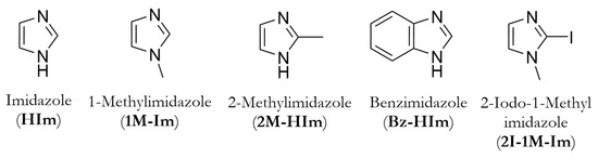This conversion has become quite popular over the years for the conversion of captured CO2 (from, for example, waste combustion, flue gases or in the atmosphere) into useful products. Indeed, cyclic carbonates have been shown to have numerous applications, and they can be used as solvents for organic reactions [10], as monomers for polymerization [11,12,13,14], as well as reactive agents in numerous synthetic pathways [15,16,17]. This reaction can be accelerated with the use of some catalysts, the first of which was a polymer-supported nanogold catalyst [18]. Numerous parallels between these various catalytic systems have been discovered, which has led researchers to the conclusion that the catalyst must adhere to certain criteria in order to effectively catalyze the reaction. The catalytic system must contain for example, a nucleophile/Lewis base that should be a good leaving group such as halides or N-heterocycles [19,20]. It should also include Lewis acid sites that can be found in metals for example [19,21], or from a theoretical point of view, Brønsted acid sites able to donate protons, which are the simplest Lewis acids. Lastly, it is important to mention that there are reports in the importance of hydrogen bond donor sites [22]. In this article we will study Imidazole (HIm) and four of its derivatives: 1-Methylimidazole (1M-Im), 2-Methylimidazole (2M-HIm), Benzimidazole (Bz-HIm) and 2-Iodo-1-Methylimidazole (2I-1M-Im) as Lewis Base catalysts (Figure 1).