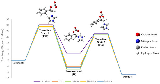 Free energy diagram (kcal/mol) reaction 1 with different catalysts; Imidazole (orange), 1-Methylimidazole (green), 2-Methylimidazole (yellow), Benzimidazole (blue), and 2-Iodo-1-Methylimidazole (purple). HIm has been selected as the representative Lewis base for structure representation.