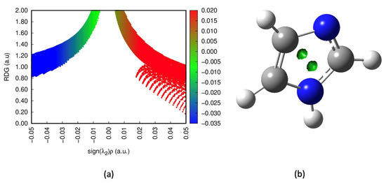 The Reduced Density Gradient (RDG) calculated within the NCI methodology is a great tool to characterize the nature of the Non-Covalent Interaction in a particular region. To help read the scatter graphs, a color-coded legend is represented in Figure 4 [30]. The RDG (y-axis) is a dimensionless quantity that approaches 0 when there are covalent and/or non-covalent interactions. For a clearer picture, we used a range of sign (λ2)ρ that describes only weak interactions such as hydrogen bonds, Van der Waals interactions and steric repulsion (Figure 4). In the case of an absence of a distinguished peak with an RDG value close to 0, as for example in Figure 5, we can assume that no NCI are present. Figure 5 shows the optimized structure and the RDG scatter graph for a single imidazole molecule. This graph allows further comparison with the catalyst structures that are related. Furthermore, in Figure 6, Figure 7 and Figure 8, we show the surfaces of the intramolecular interactions of I1 HIm, 2M-HIm and 2I-1M-Im, respectively, as well as their RDG scatter graph. The NCI graph and results for I1 1M-Im and Bz-HIm are present in the Supporting Information (Figures S5 and S6).