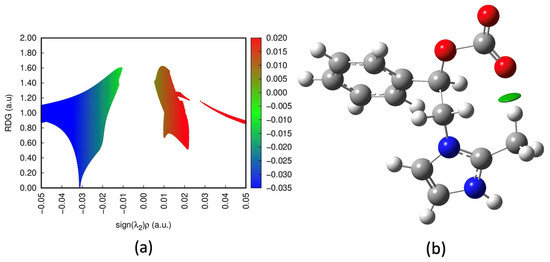 (a) The Reduced Density Gradient (RDG) scatter graph representing the NCI of I1 2M-HIm shown in Figure 7b. (b) Visual representation of the NCI as a green surface.